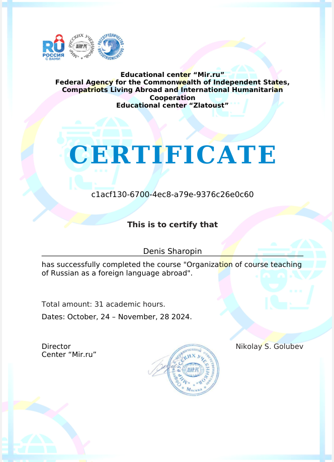 My name is Denis Sharopin and I have more than 30 years studying and more than 10 years teaching languages.